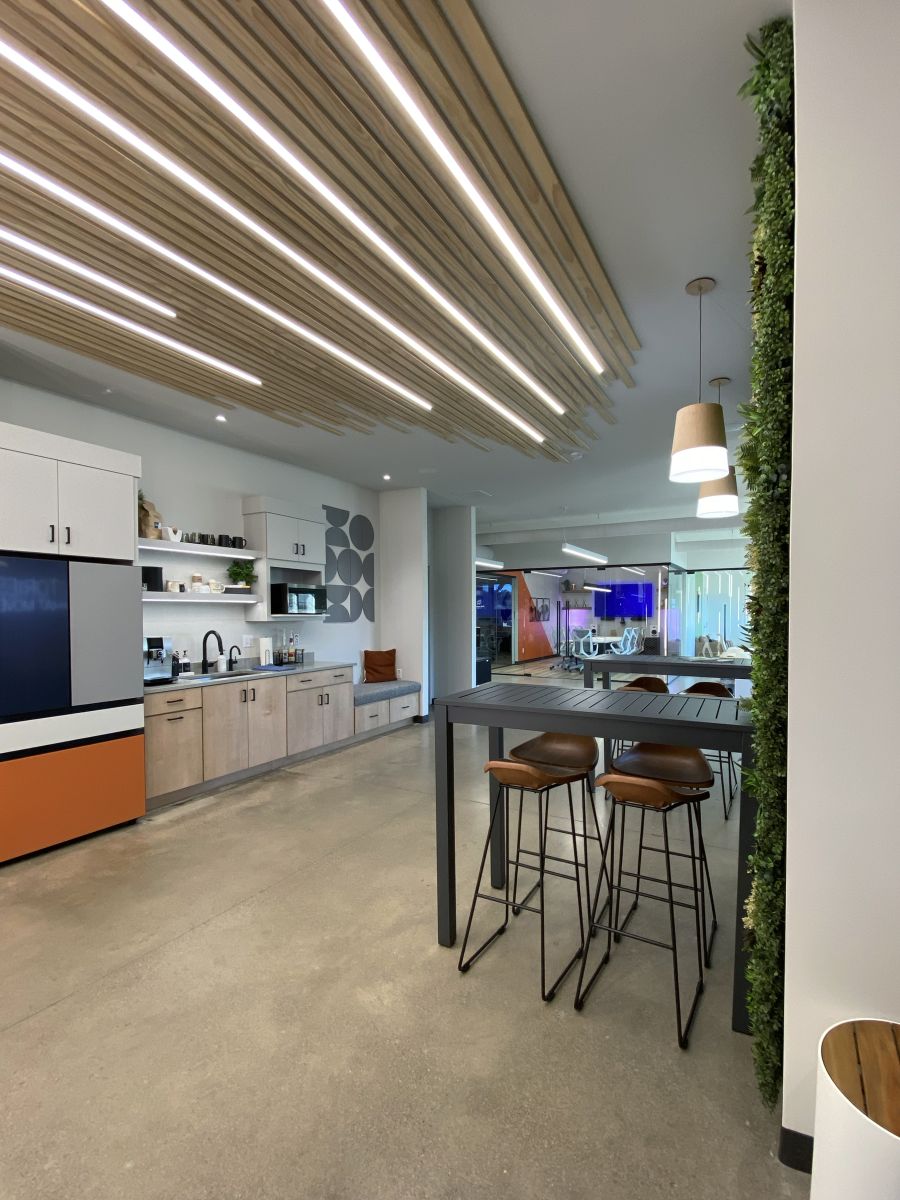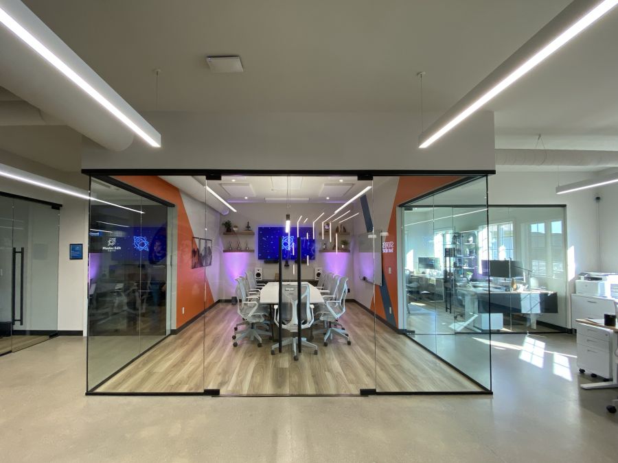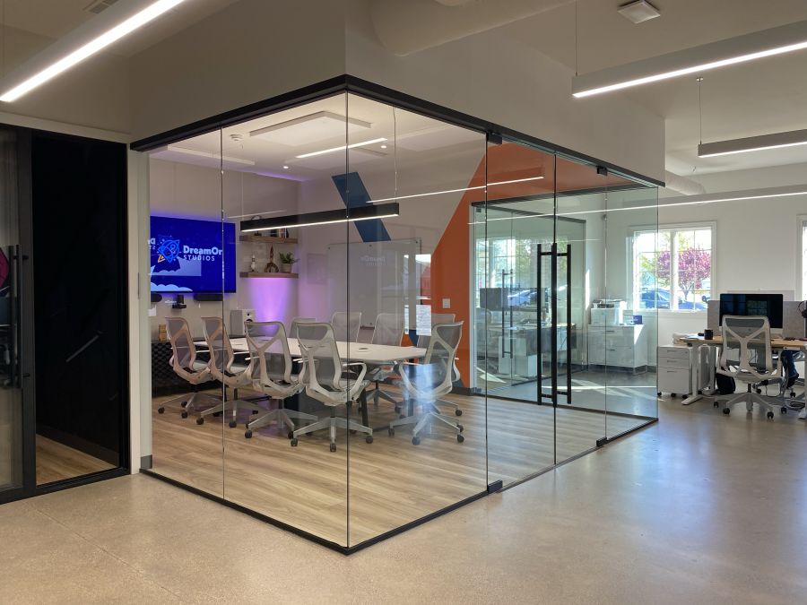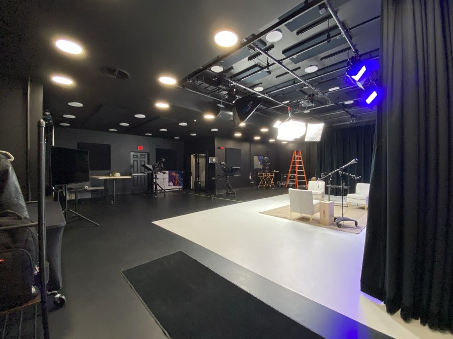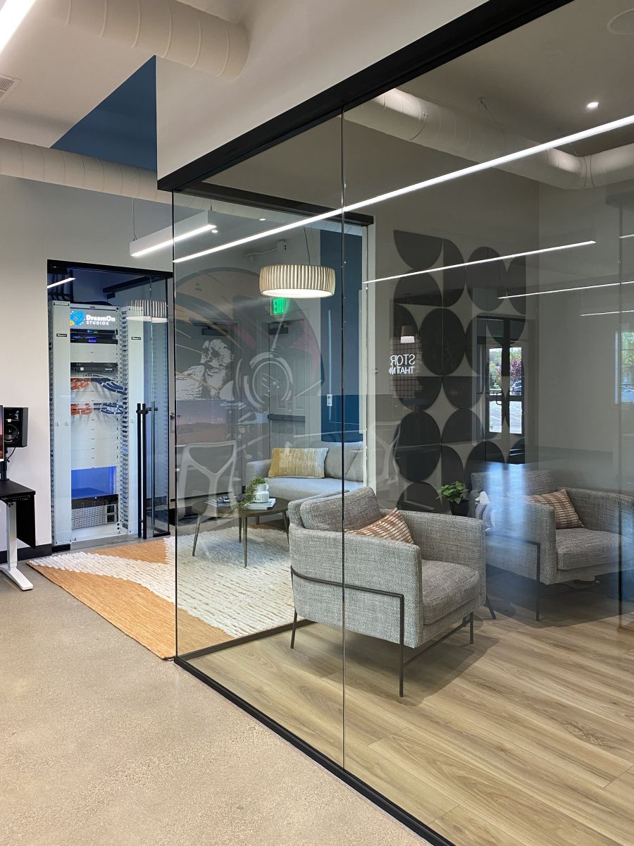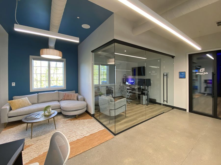 Multimedia work spaces pose unique construction challenges. Our teams assessed and solved all of them: new truss modifications to heighten the ceilings for stage lights, extensive noise dampening measures, and exterior renovations to control incoming light. All of this was done in tandem with a makeover of floor-to-ceiling glass office walls and polished concrete floors.