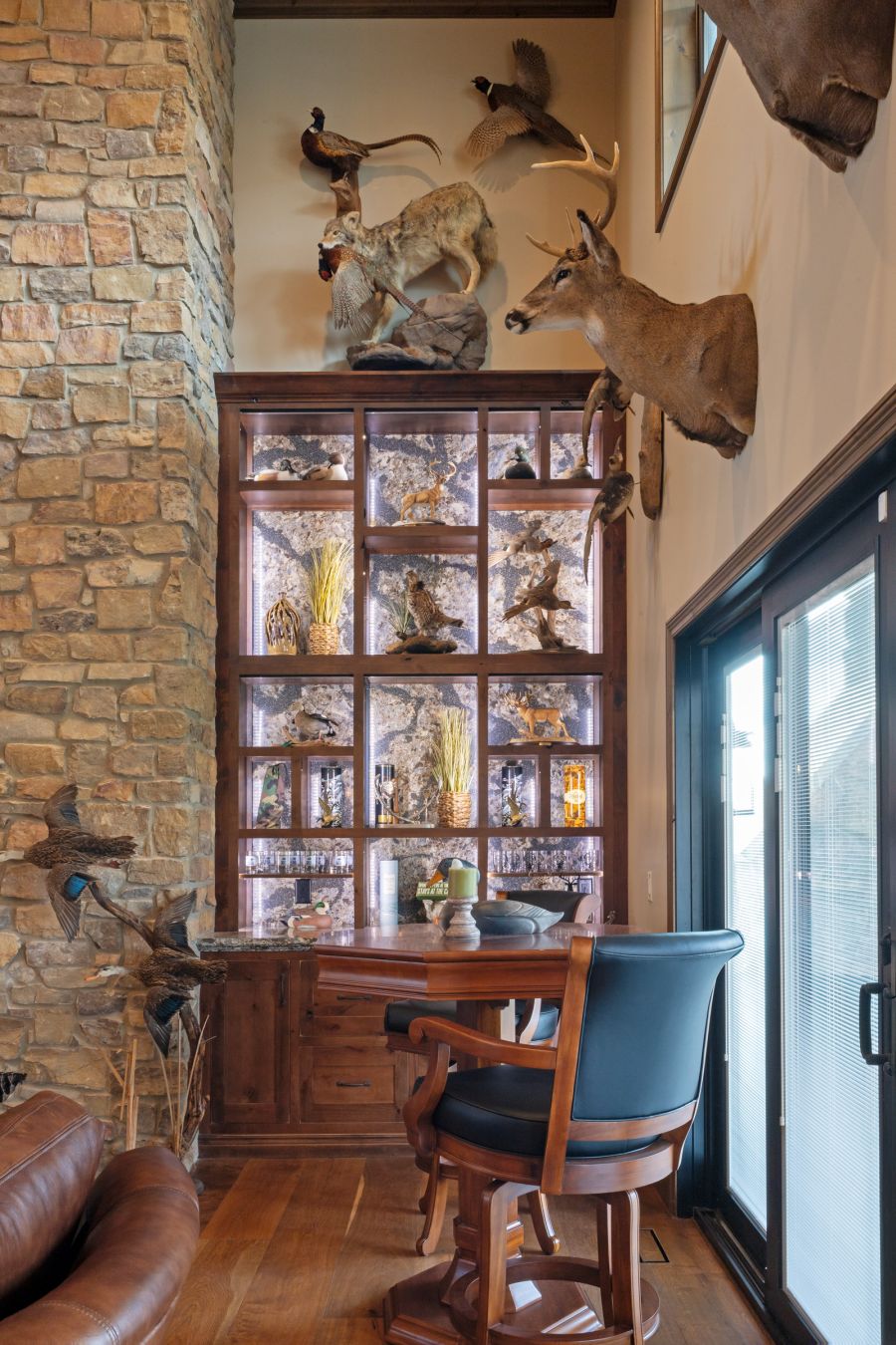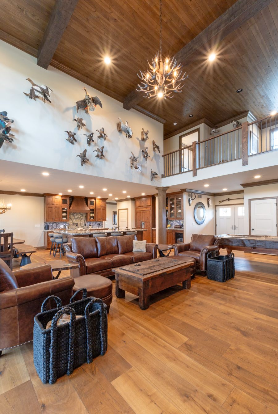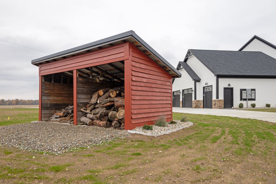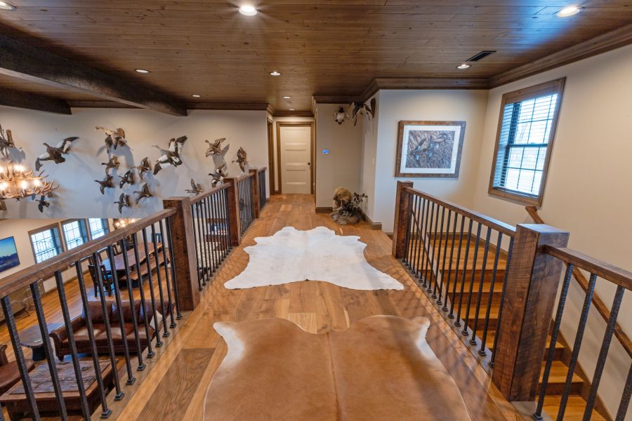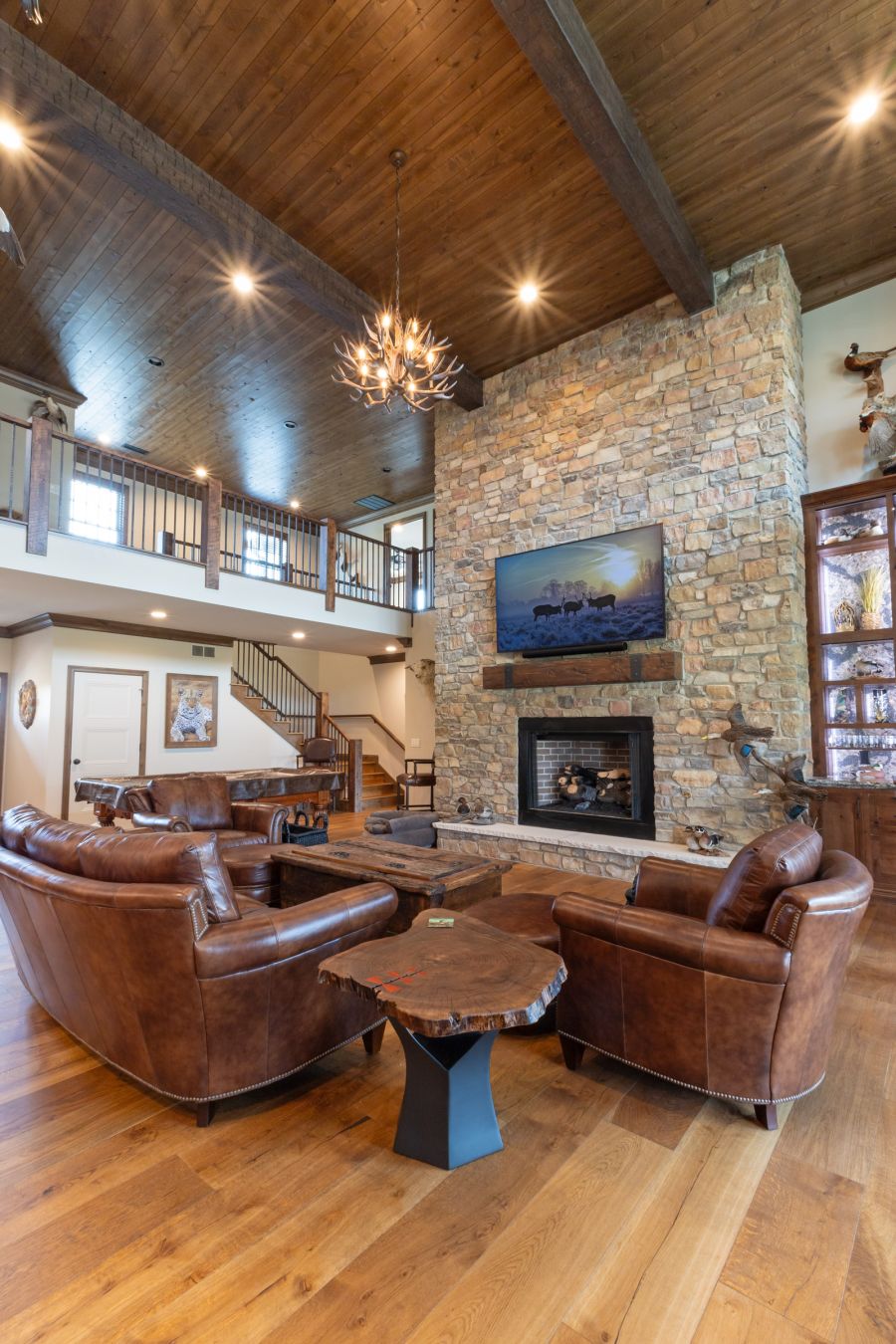 This rustic hunting lodge in Coldwater, MI, perfectly captures the essence of the great outdoors. With five bedrooms, three and a half baths, and 4,095 square feet of space, it offers the warmth and charm of a retreat while embracing luxurious touches. The centerpiece is a stunning floor-to-ceiling stone fireplace in the great room, complemented by antler chandeliers and rustic hardwood floors. Mounted wildlife and custom knotty alder cabinets complete the lodge ambiance, making it a haven for nature enthusiasts. Outside, a cozy patio with a wood-burning fireplace invites you to unwind in the natural surroundings.