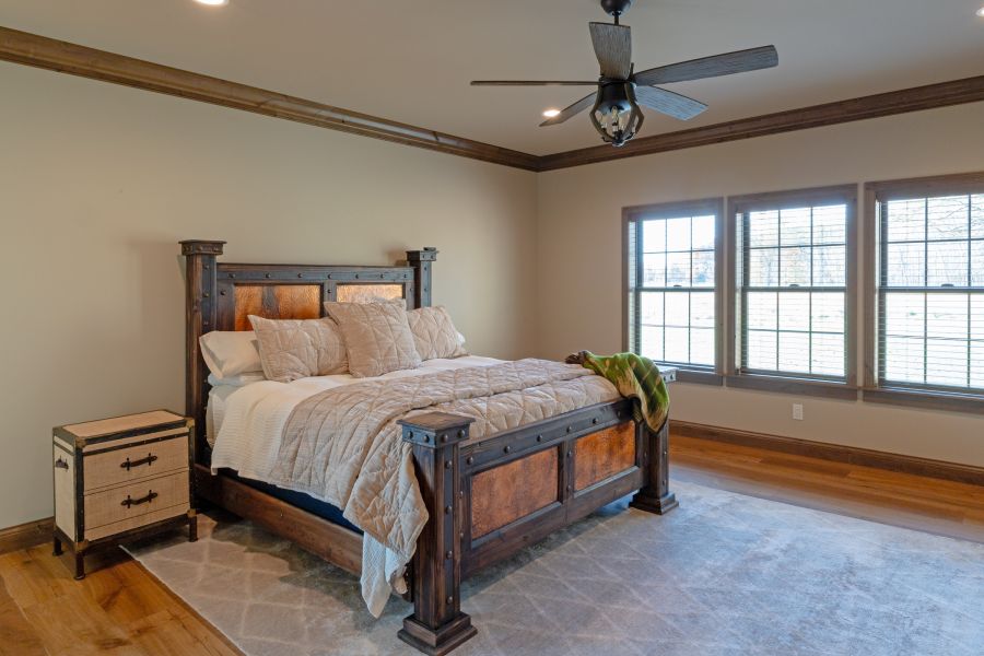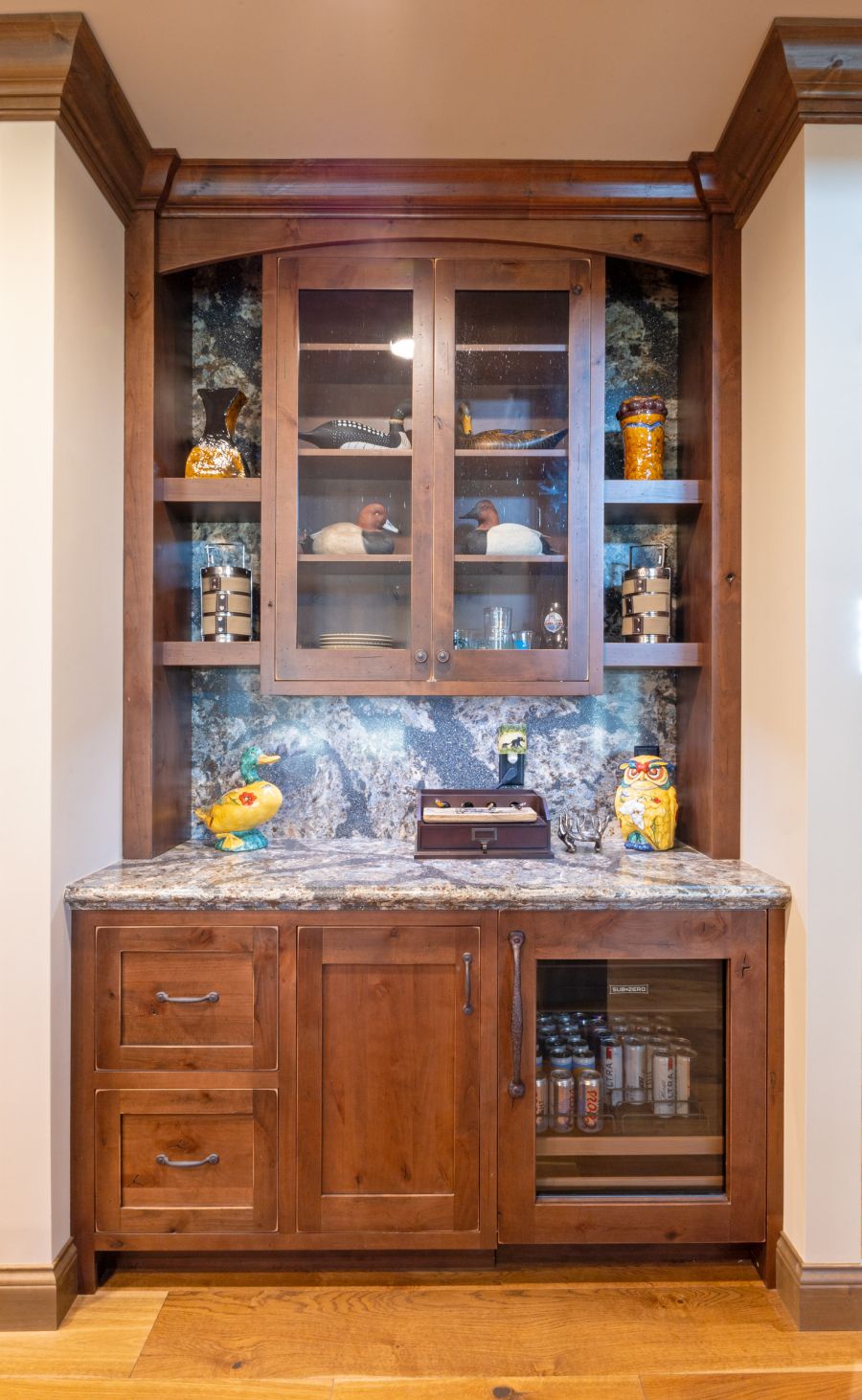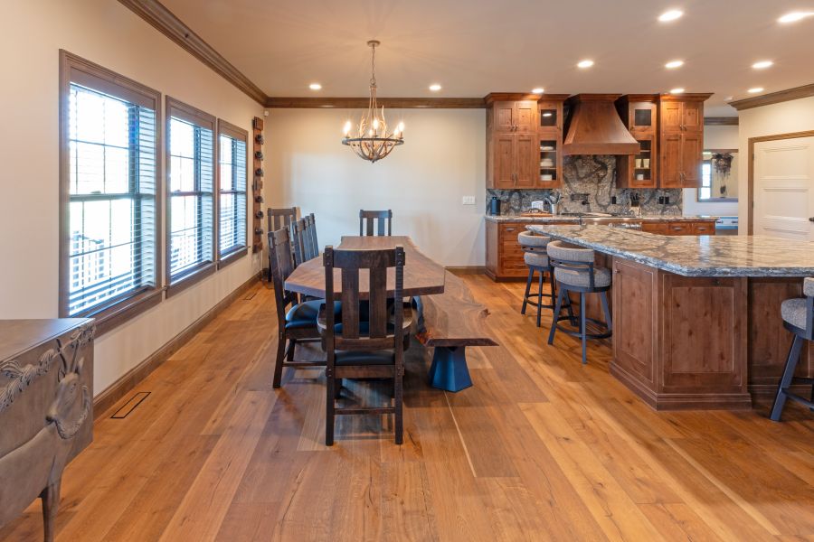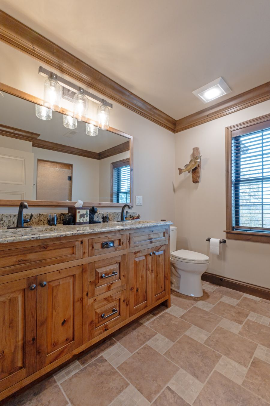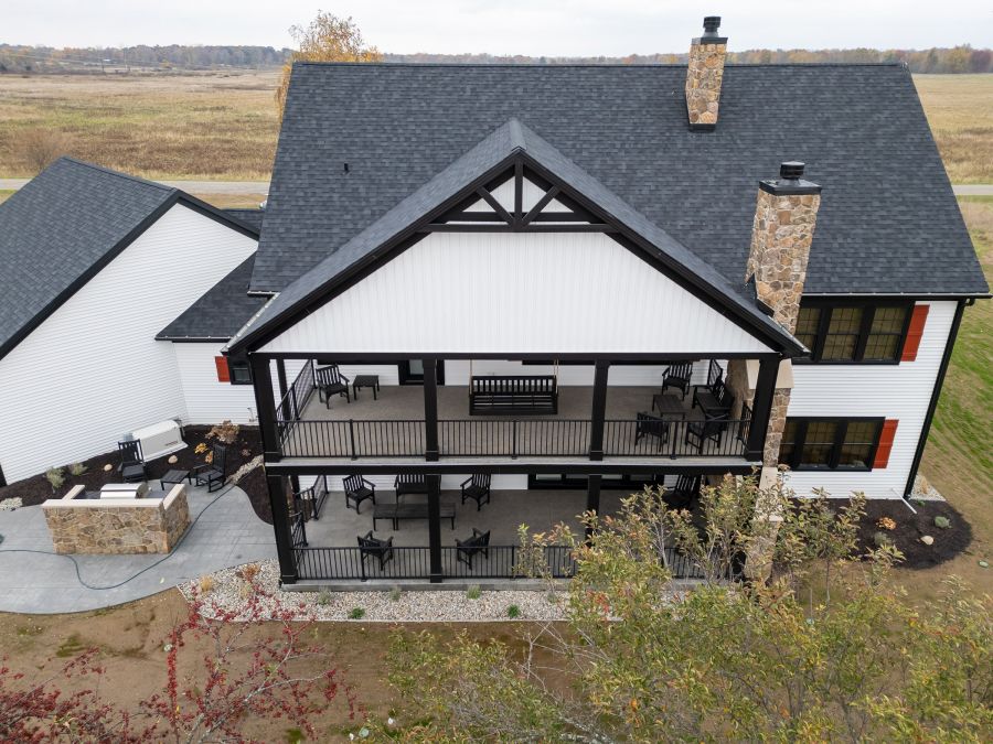 This rustic hunting lodge in Coldwater, MI, perfectly captures the essence of the great outdoors. With five bedrooms, three and a half baths, and 4,095 square feet of space, it offers the warmth and charm of a retreat while embracing luxurious touches. The centerpiece is a stunning floor-to-ceiling stone fireplace in the great room, complemented by antler chandeliers and rustic hardwood floors. Mounted wildlife and custom knotty alder cabinets complete the lodge ambiance, making it a haven for nature enthusiasts. Outside, a cozy patio with a wood-burning fireplace invites you to unwind in the natural surroundings.