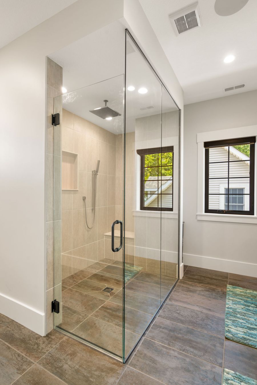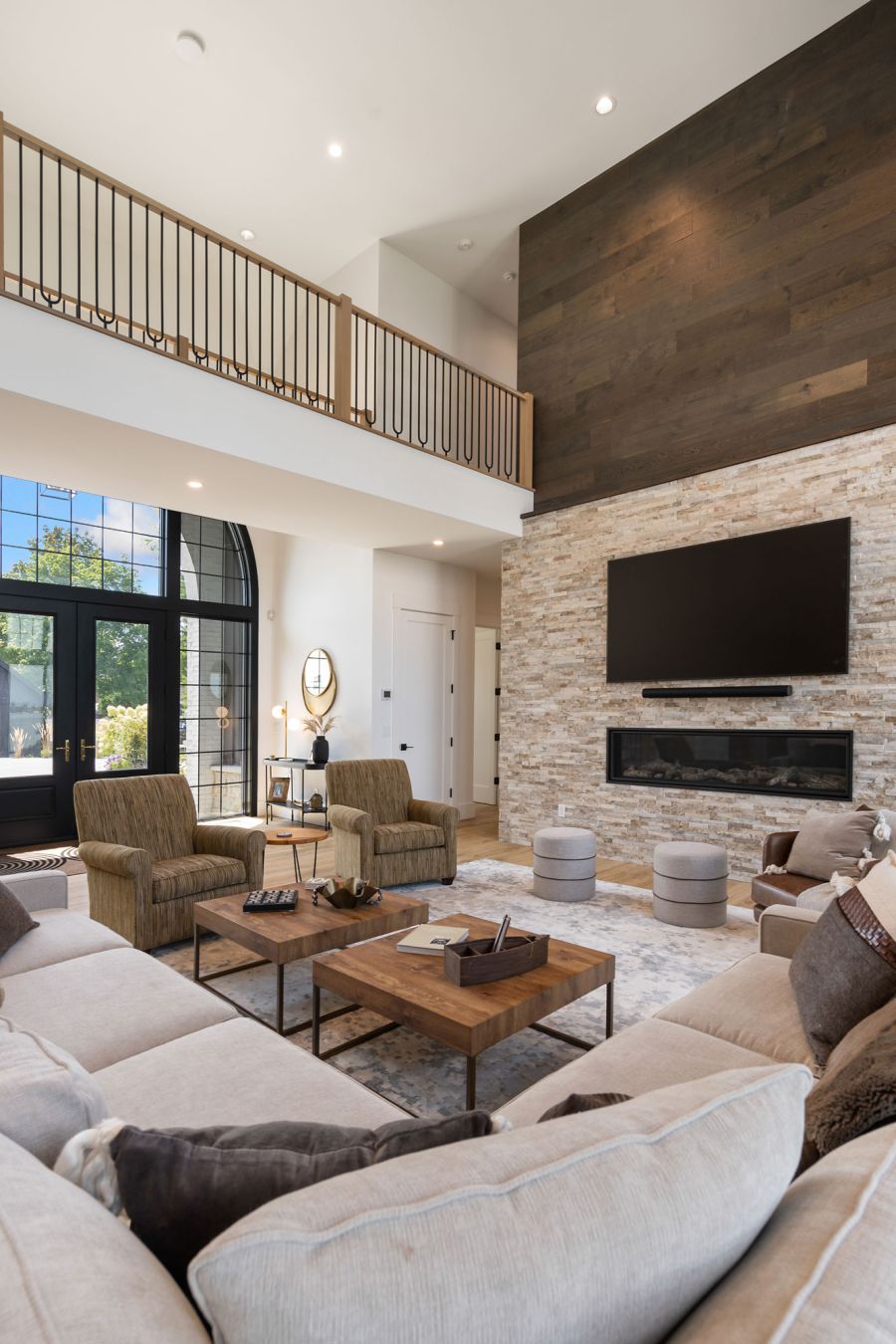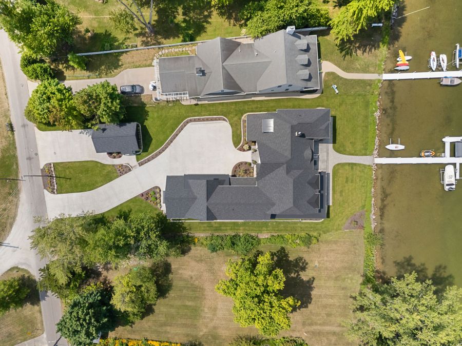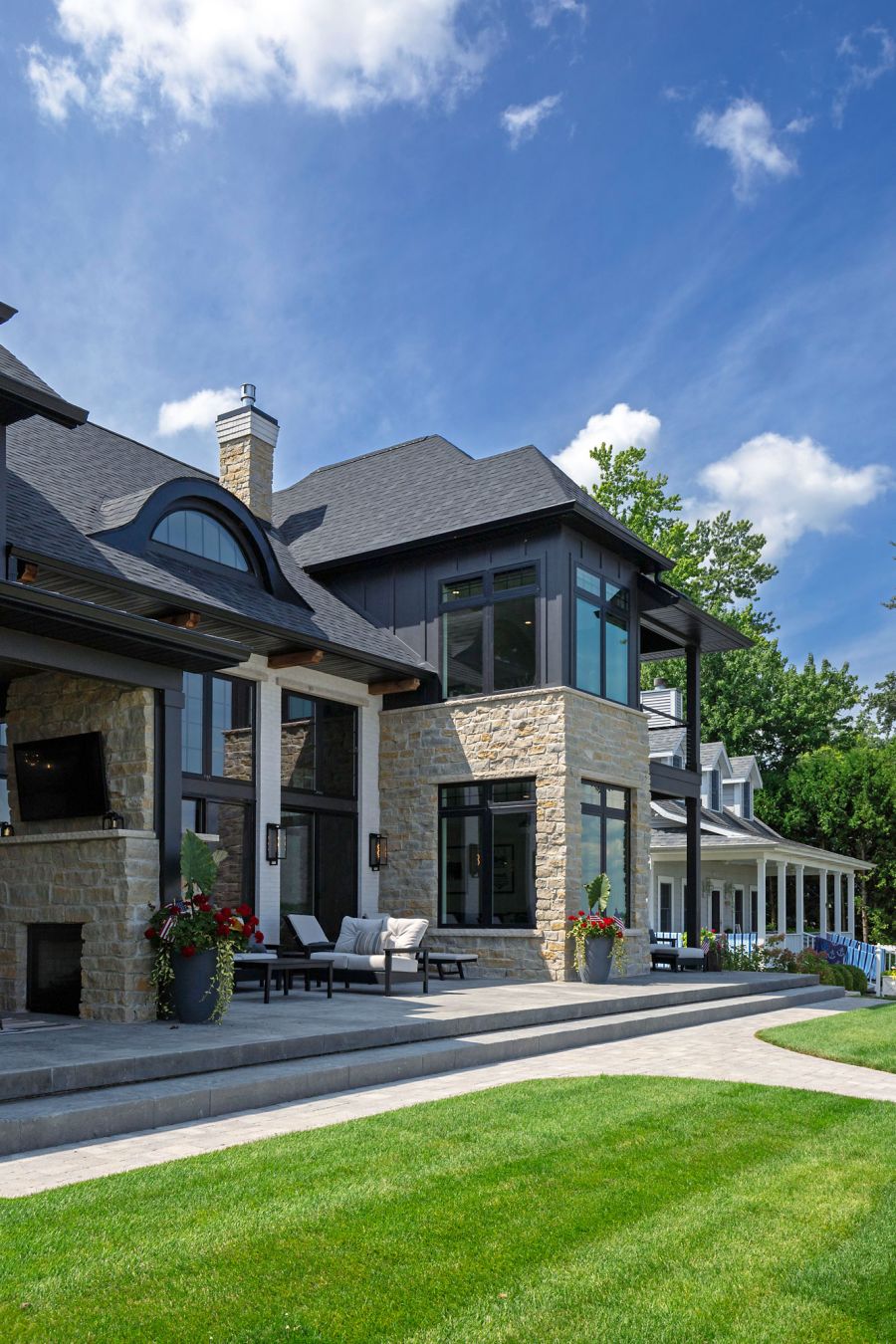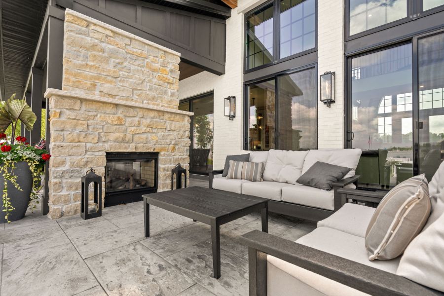 Outdoors, a covered veranda with a double-sided fireplace and TV offers the perfect spot to unwind and enjoy lakeside living.
