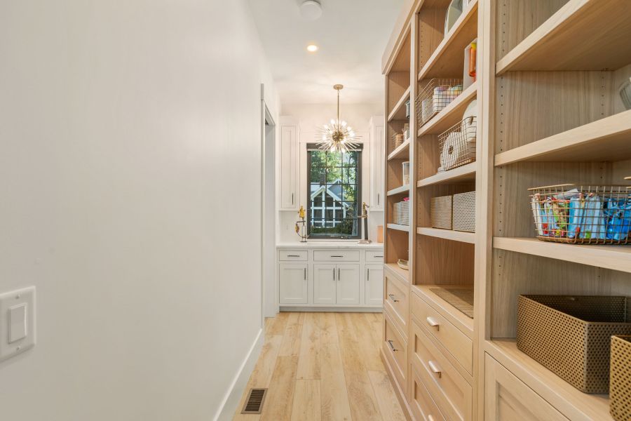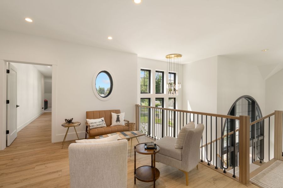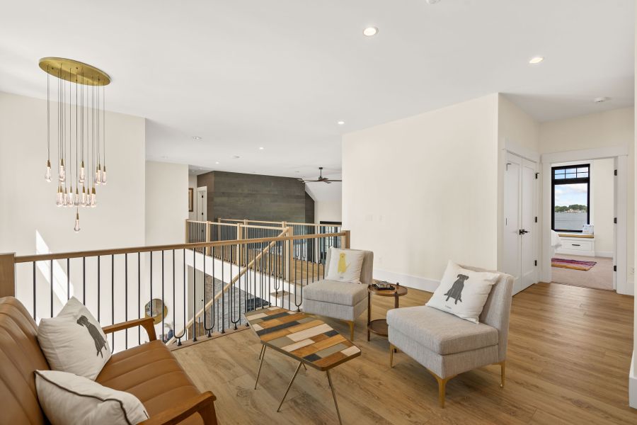The open-concept main floor boasts a large kitchen island, glass-lined entryways, and a serene sitting room for moments of solitude. Upstairs, the master suite features a covered balcony with lake views, a spa-like bathroom, and a spacious walk-in closet, while a catwalk leads to the other bedrooms and a charming bunk room.